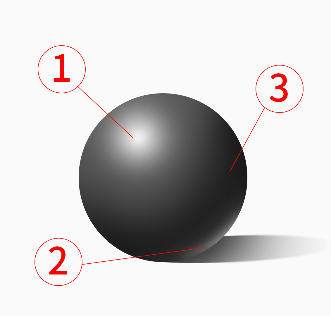 这是一个很简单的实例图,因为形状是球体,所以高光的形态类似点状,这里图中标1的位置就是球体的高光,而标3的位置很明显是物体区域最暗的部分,所以这里是暗部,而标2位置则是在暗部中有偏亮的部分但亮度要低于1,这里是物体反光区域,也可以理解为由地面反射的光所形成的,而反光的作用就是将暗部区域变得更加通透,不会给人一种漆黑一片,毫无变化的感觉;其实设计修图很多情况下就是修明暗关系,修体积感、立体感!