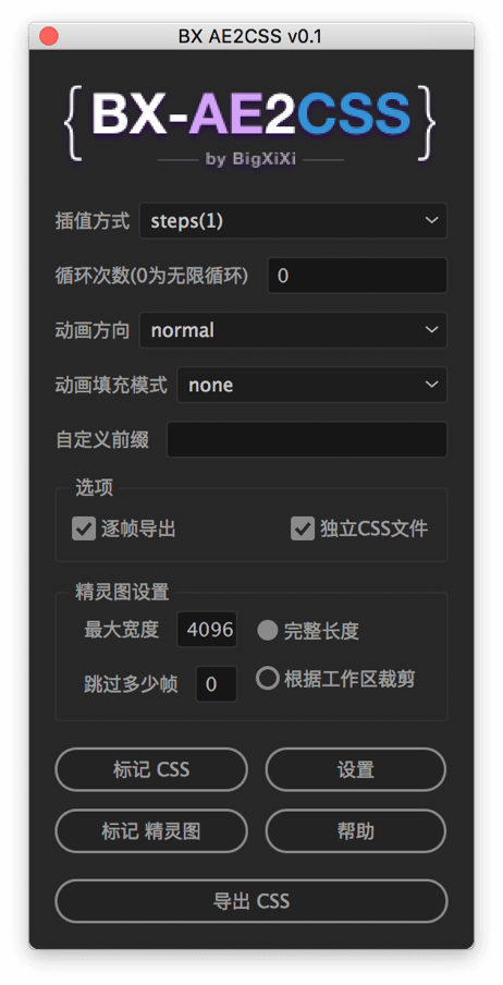 当我们把所有序列合并在一张图片上往往还是不够的,我们还需要提供给开发具体哪个时间显示哪一部分的具体参数。我们可以直接通过 AE 插件 CSS Sprite Exporter (By Bigxixi) 直接快速的输出开发所需的代码和精灵图。