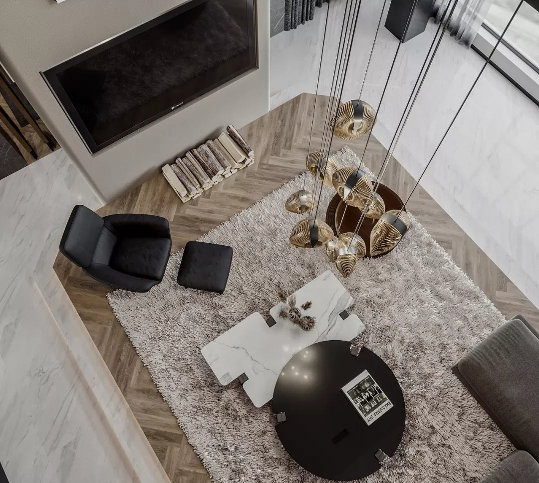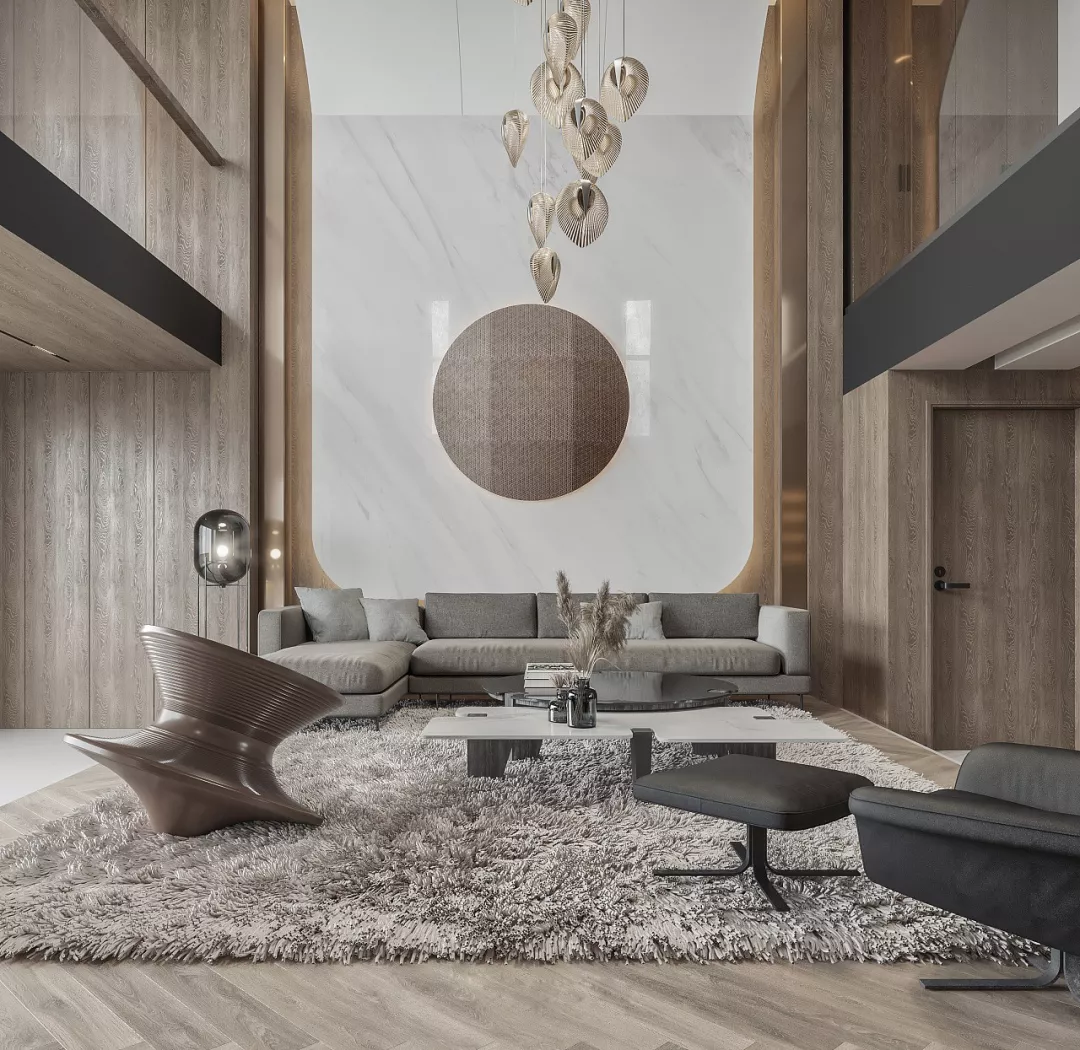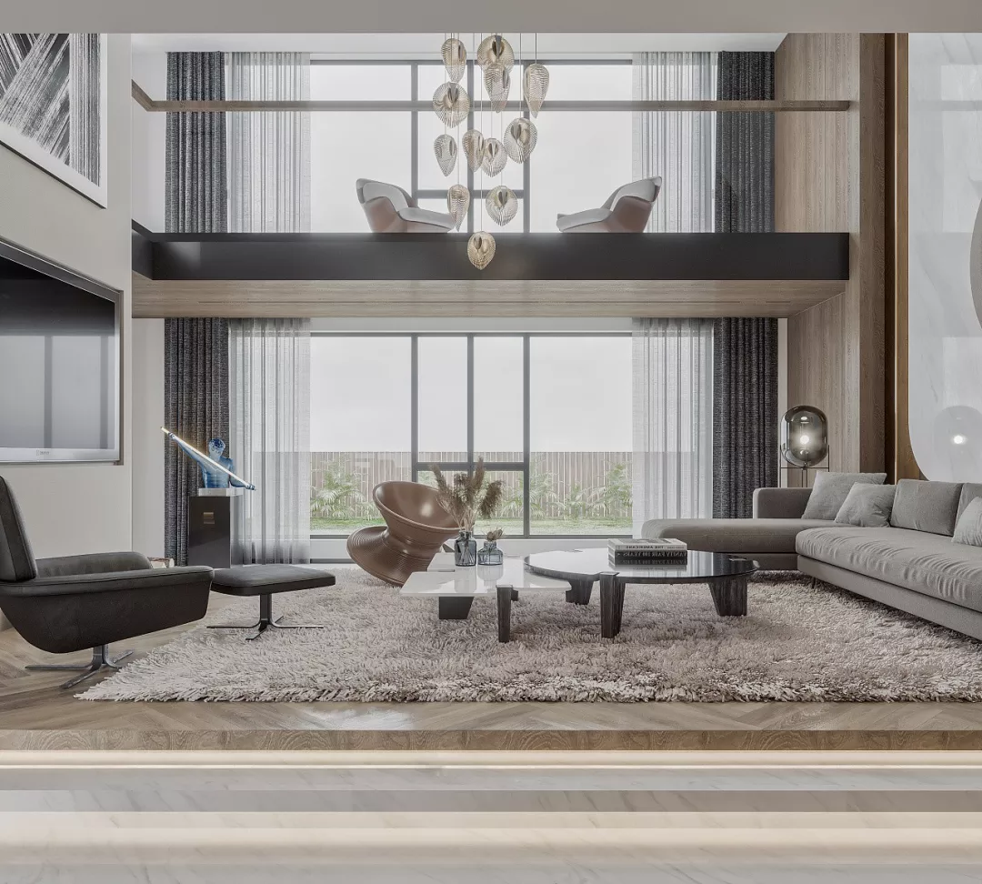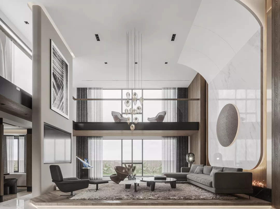 双层挑高的玻璃墙面为居住空间提供充足的自然光线与饱览户外自然风光的开阔视野,流苏扇式吊灯兼具创意与美感