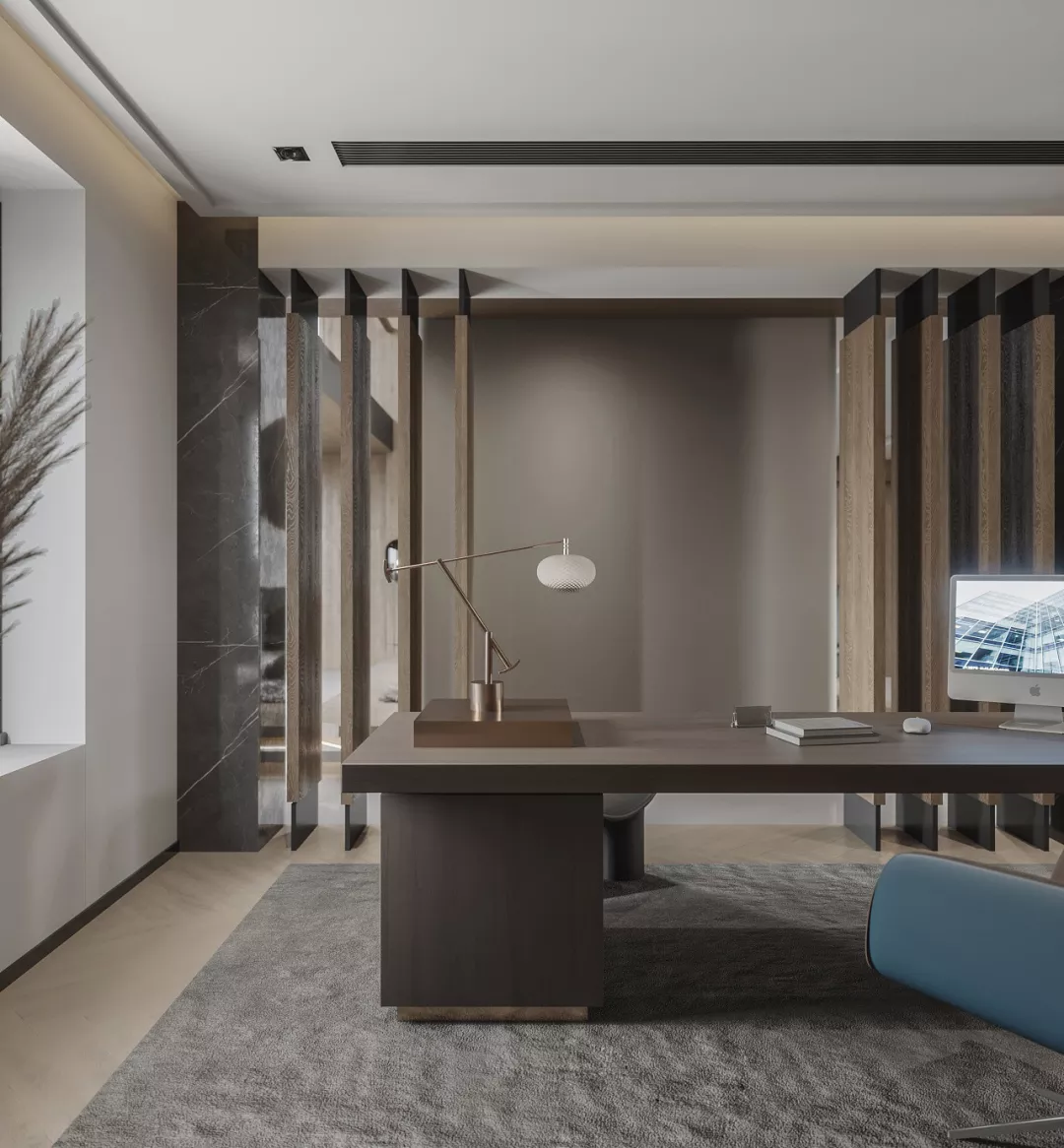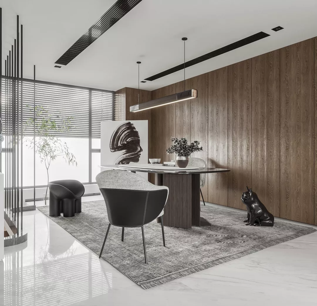 书房以原木墙板作为装饰,从办公桌到椅子再到地毯,颜色搭配均偏暗色系,彰显出了主人公沉稳内敛的个性
