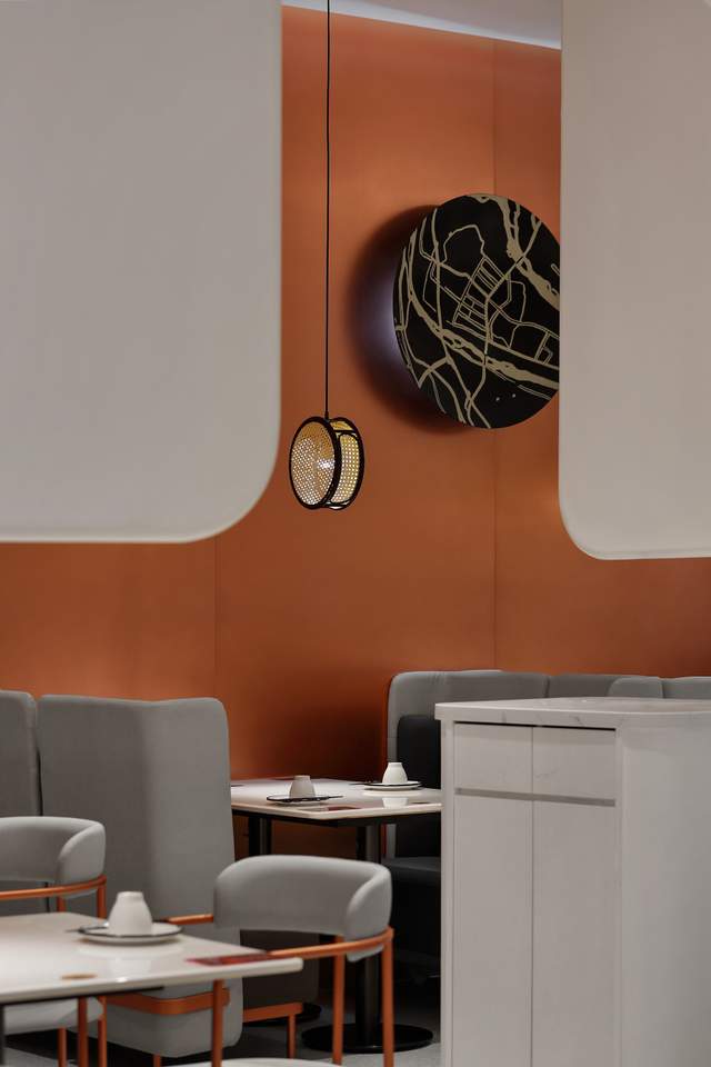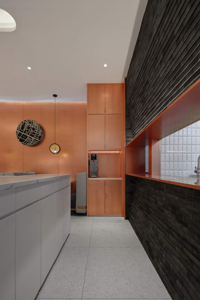 项目用材:烧制青砖、橙色不锈钢、白色烤漆钢板、水磨石地砖
