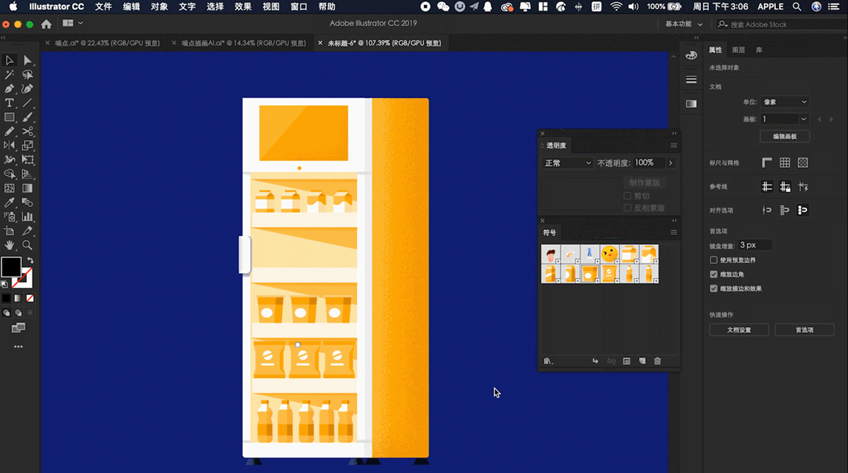 如果是单个物体操作则比较简单,直接拖入符号工具即可形成符号,在做可重复性的单个物件时可以用到,例如我在做货架时,单个插画小物件是经常都要复用的,所以我就把它作为符号储存,后面需要使用时就非常方便: