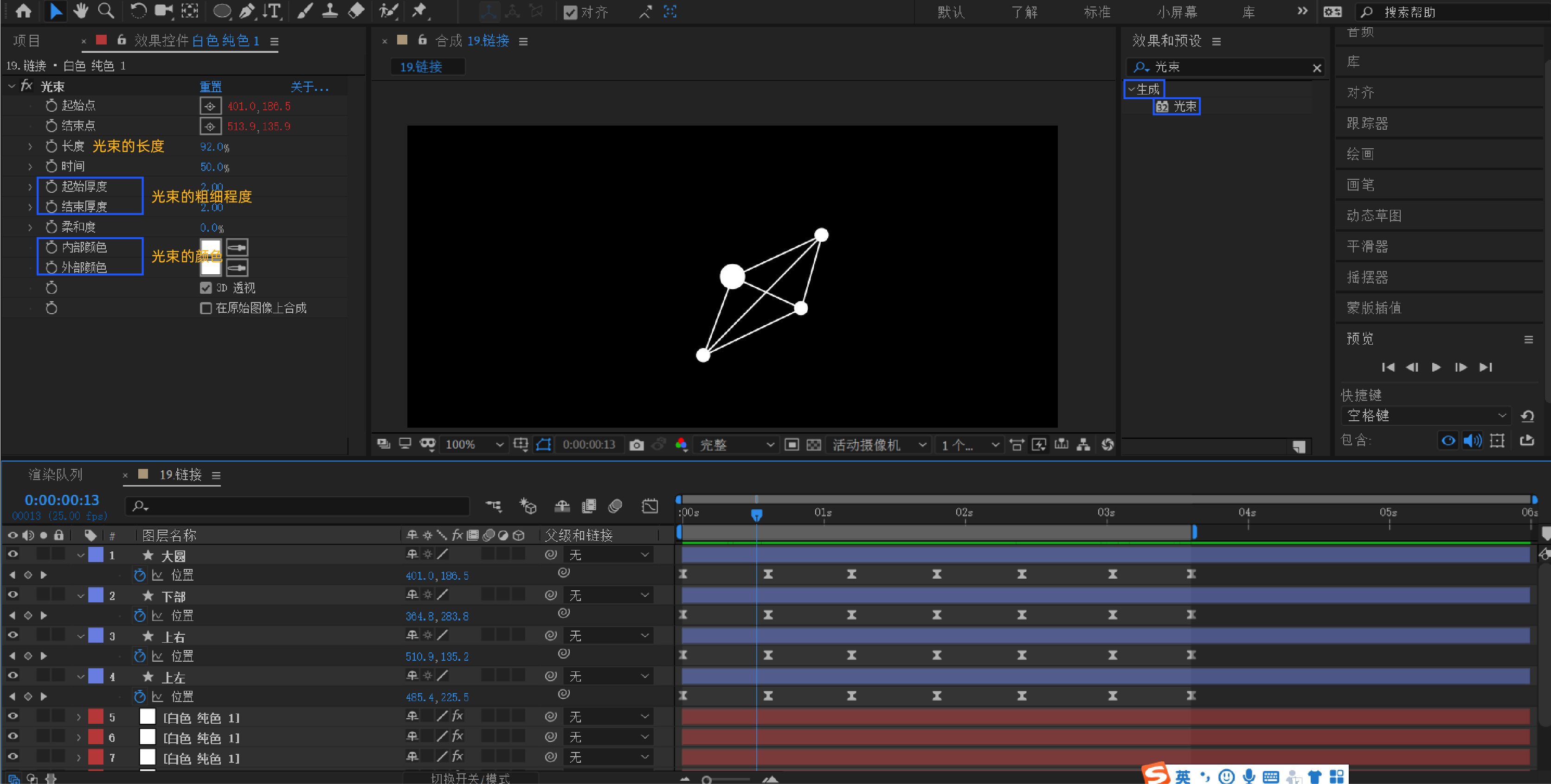 步骤:新建合成,绘制一个圆形,复制三个,改变大小和位置,然后新建纯色层,在效果和预设里找到光束并拖拽到纯色层上,柔和度改为0,颜色改为白色,调整长度以及厚度,然后选择两个圆形调出位置属性,之后为光束的起始点和结束点添加表达式,关联到两个圆形的位置上,(如果此时光束并没有把两个圆连接上可调整光束的长度),然后复制纯色层,选择其他的两个点重复上述操作,知道点皆两两相连,(共6根),然后为所有的圆的位置加关键帧每隔15f调节一下圆的位置,然后为所有关键帧添加缓动并调节运动速度。