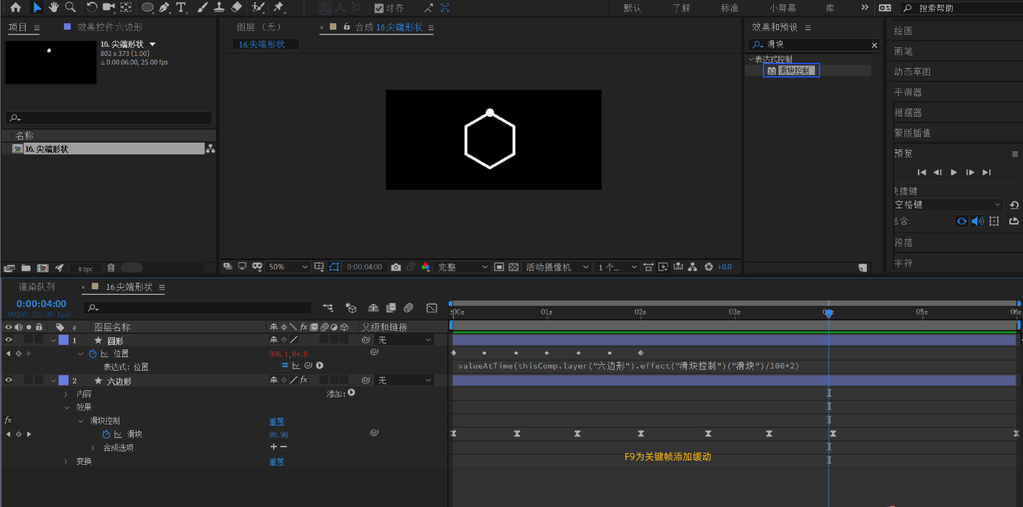 步骤:新建合成,绘制一个六边形(要勾选贝塞尔曲线路径),然后为六边形添加修剪路径,在效果和预设中找到滑块添加到六边形上,在修剪路径中的结束属性添加表达式,并将表达式关联器拖拽到滑块上,在0S时为滑块添加关键帧数值为0,在2S时滑块数值为100,然后绘制一个圆形,找到六边形的路径进行复制,到小圆的位置上(要在0S时)进行粘贴(如出现偏差手动调节因为路径是按你第一次绘制的路径产生的如中途有移动都会产生一定的偏差),为小圆的位置属性添加表达式,找到添加Property-valueAtTime(t),用鼠标选中t,然后将表达式关联器拖拽到滑块上,因为滑块动了100步,小圆运动时间是2秒所以表达式后面需要除以100乘以2,然后圆形每次画过的端点都加一个关键帧并为关键帧添加缓动,然后调整运动图表,让整体的运动更加自然,然后在6S时加滑块的数值改为0,加缓动并调节速度。