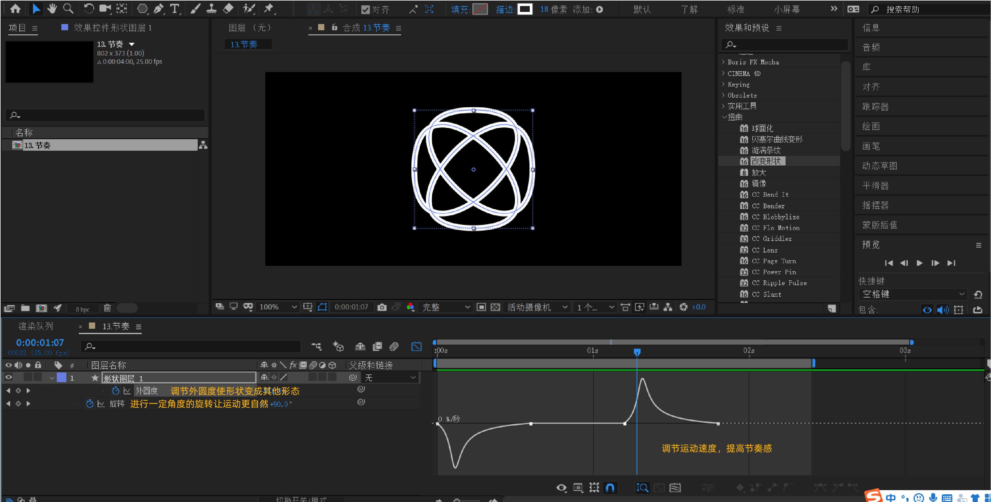 原理:移动锚点属性使物体与锚点产生距离,为旋转属性添加关键帧或表达式。