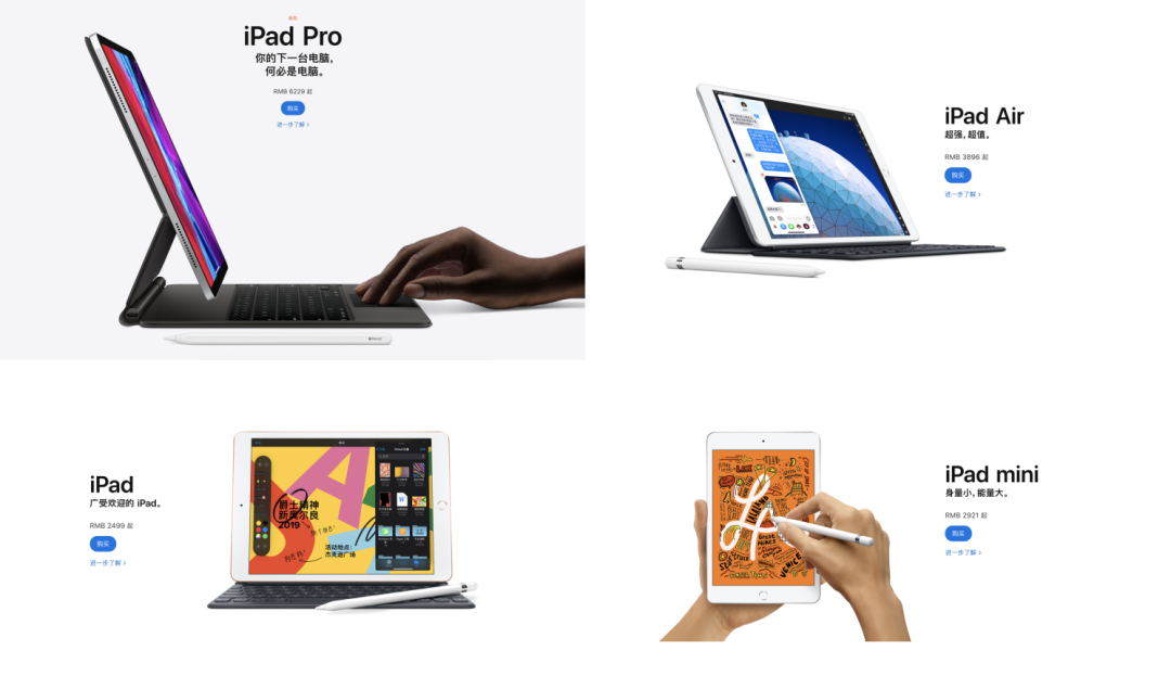 说到言之有序,我们看 iPad 的页面介绍。四款产品,分别是:iPad Pro、iPad Air、iPad、iPad mini。