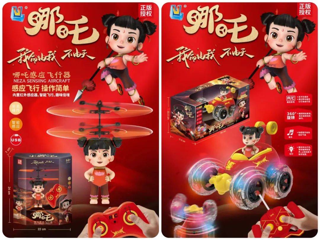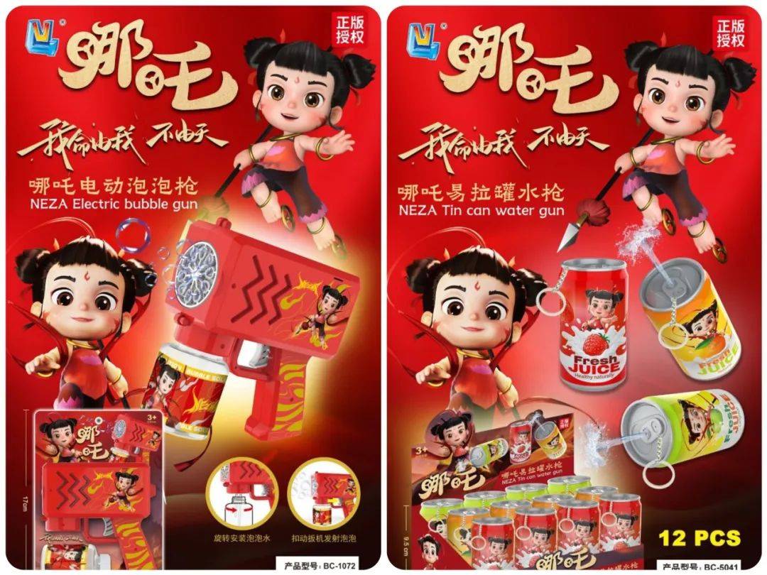 哪吒盲盒易拉罐水枪、哪吒万向滑板车、哪吒泡泡棒、哪吒掌中打地鼠等IP联名玩具,既融合哪吒IP中的经典元素,更兼具互动性与收藏价值。