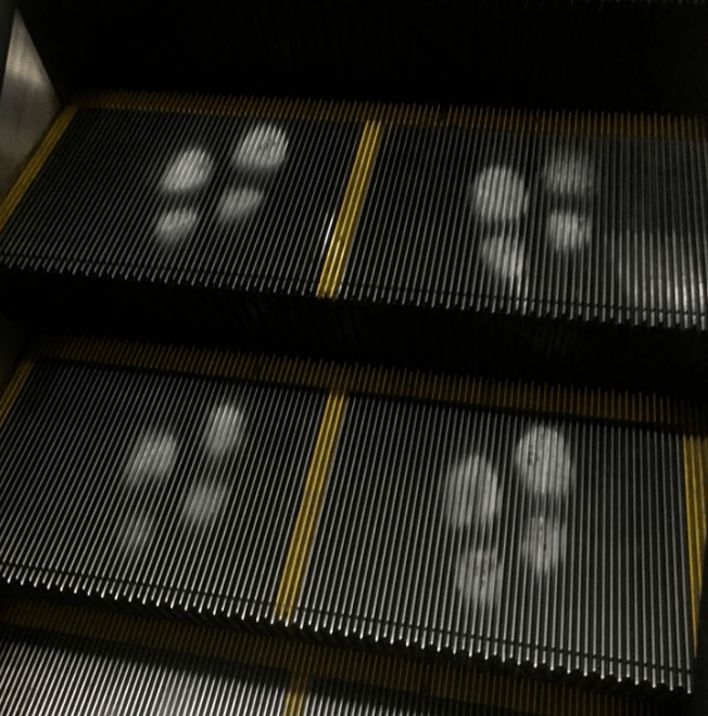 其中有一站,电梯上有双排脚印,这是在让大家站两排吗?