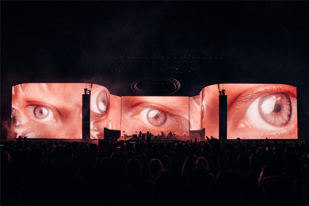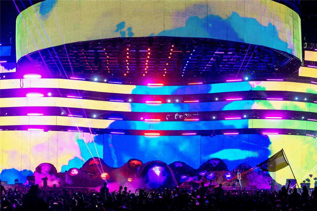 他令一个庞大的电子屏装置吊在舞台顶端,在 Jay-Z 表演时如穹顶一般在舞台上方伸展开,屏幕中的影像吸引着四面八方的观众视线。