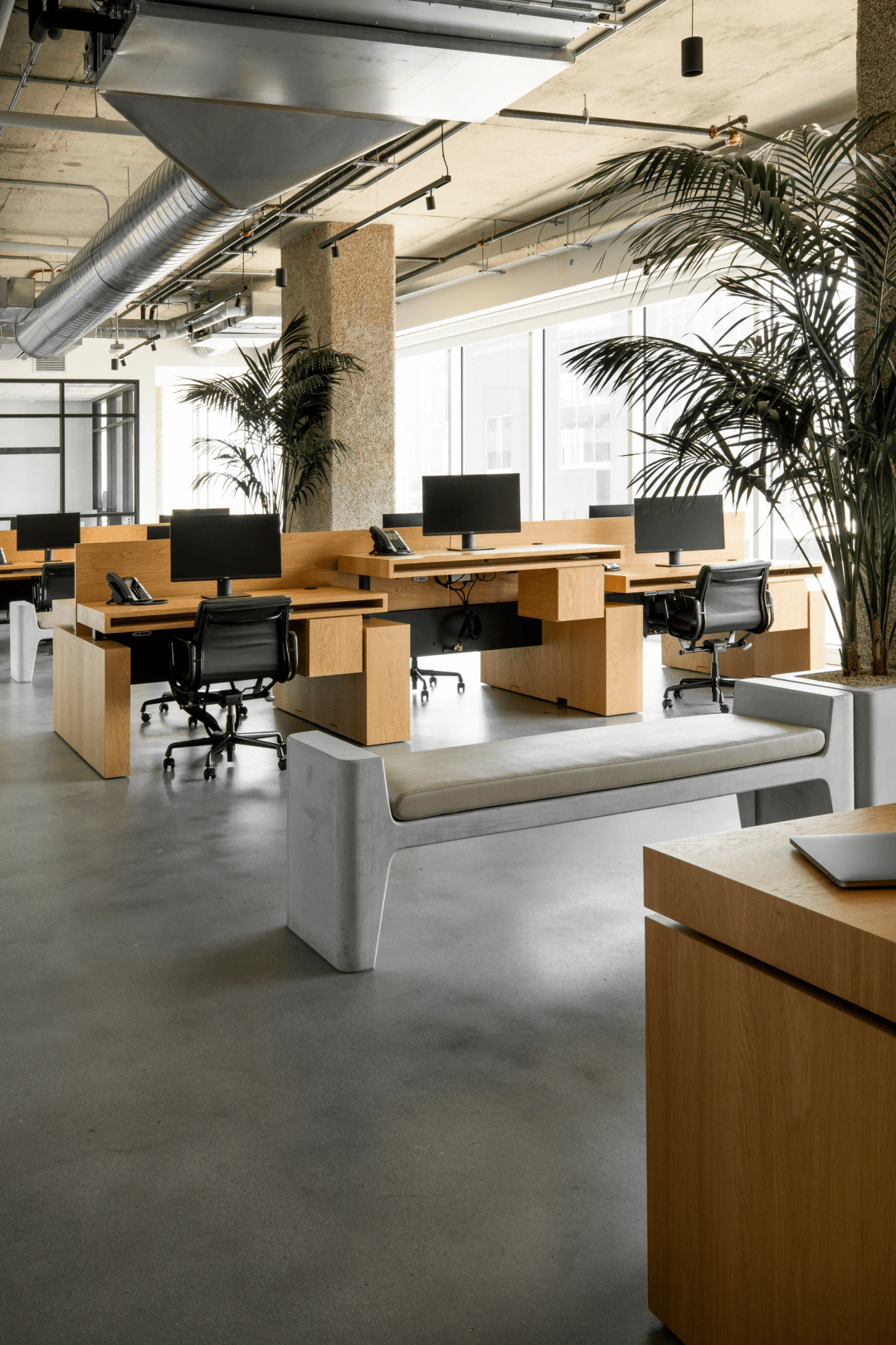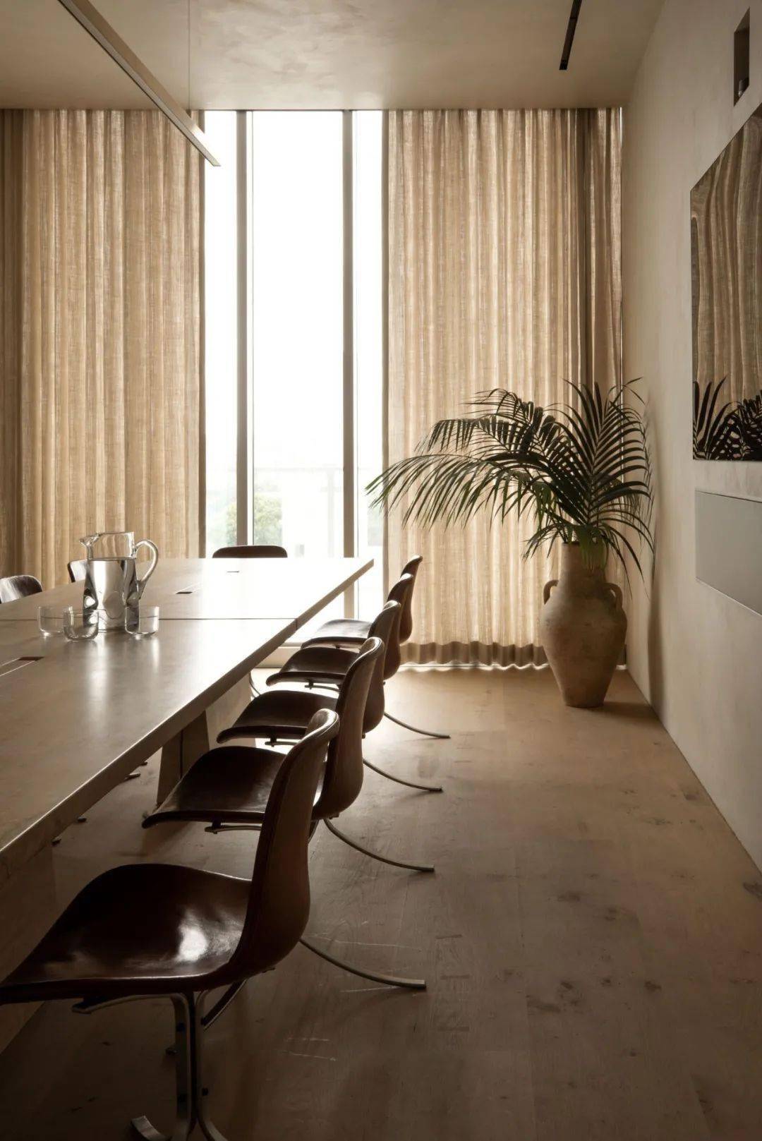 在固定中央会议/餐饮区,定制的蛇形长椅构成一处开放的卡座,皮革、石膏和橡木的纹理为会议室的单色调增添了活力。这 是野蛮主义和极简美感的结合。