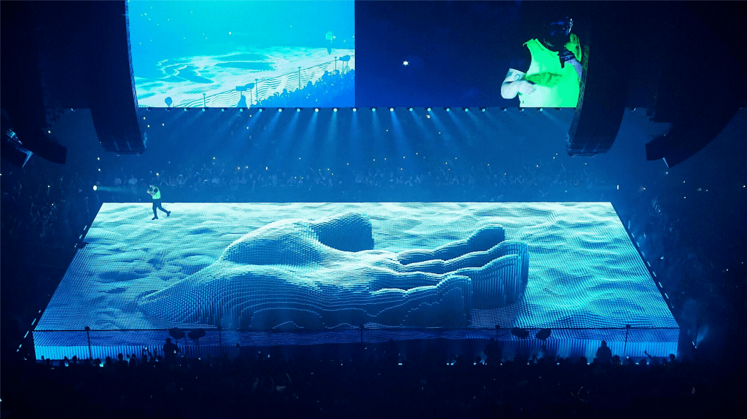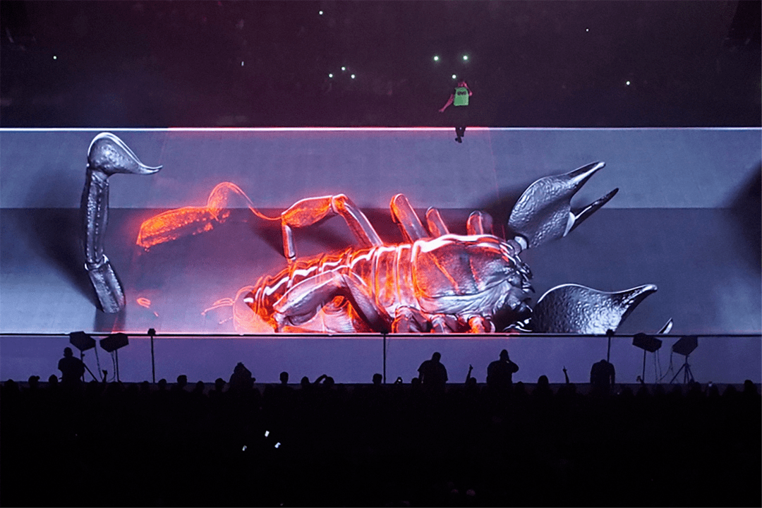 在这场名为 Aubrey and the Three Amigos Tour 的巡演中,Willo Perron 用了 200 个无人机、数字 LED 地板以及一台在空中飞行的黄色法拉利,场中央的「酷炫蝎子」和「巨型手掌」的画面,是用裸眼3D技术呈现的,相当具有视觉冲击力。