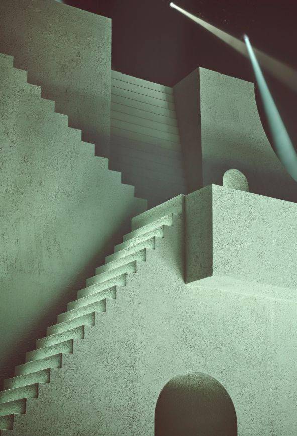 无论是拱顶,桥体还是阶梯的造型,都强烈突出了一种表现主义的戏剧风格。