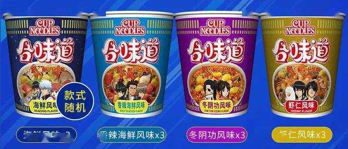 和银魂联动的合味道除了有正常的口味,还有3款限定款包装,分别是草莓牛奶海鲜风味、红豆海鲜风味和妙姐专属黑暗香辣海鲜风味。