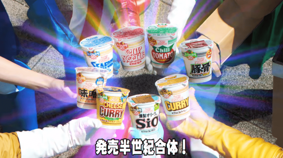 前阵子,日清还推出二合一口味泡面,用了特摄片风格,也是沙雕的极致。