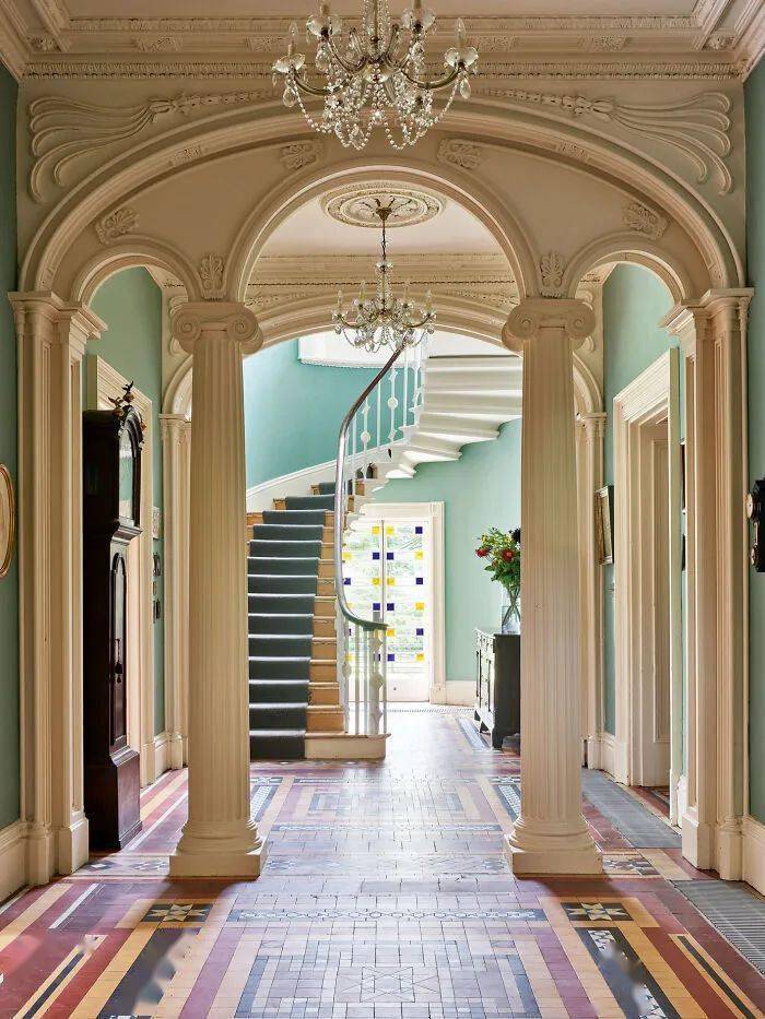 入口大厅由三拱柱状屏风分隔这是一座最近修复的19世纪希腊复兴乡村别墅位于英格兰北约克郡