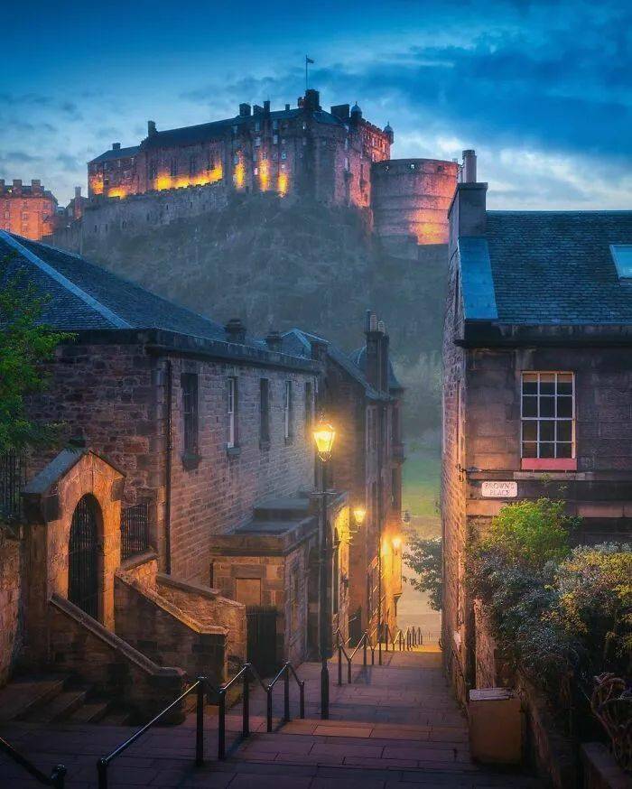 从苏格兰爱丁堡老城的维内尔台阶上看爱丁堡城堡及其半月形炮台