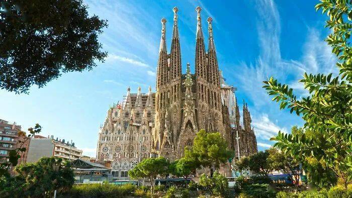 巴塞罗那的圣家堂内部由安东尼高迪设计建设始于1882年但仍未完工预计将于2026年完工正好赶上高迪逝世100周年