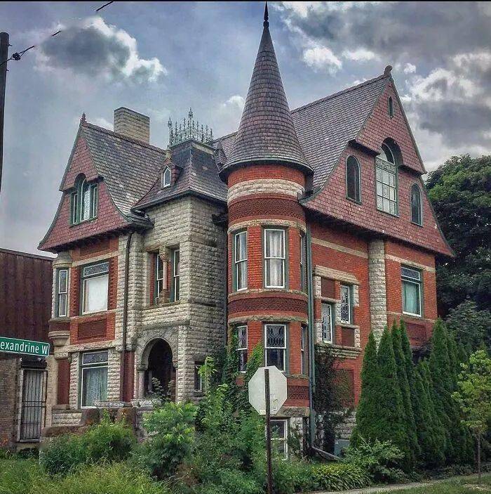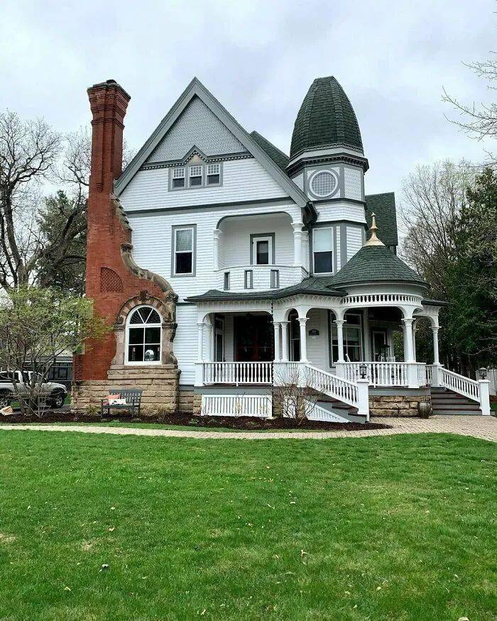 维多利亚女王安妮之家建于 1894 年带有一个环绕窗户的超大拐角砖烟囱
