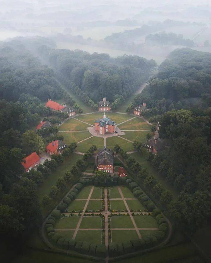 德国下萨克森州的Schloss Clemenswerth是一座18世纪的巴洛克式狩猎中心其中央凉亭周围环绕着八间小型小屋供客人使用