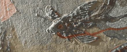 金箔是岩彩画的重要组成部分,点点金箔自撒金筒降临画布,形成像花火一样的金色斑驳。