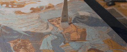 在天然矿物研磨成晶末,一层又一层上色后风干,才得以进入到下一步。