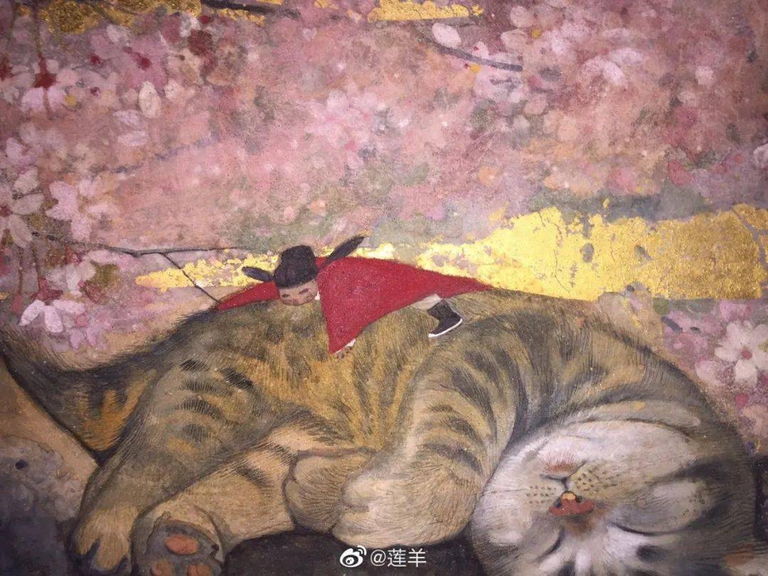 2013年,莲羊偶然在网上看到一幅画。画中是一只猫,色彩鲜艳,像油画,又像壁画。